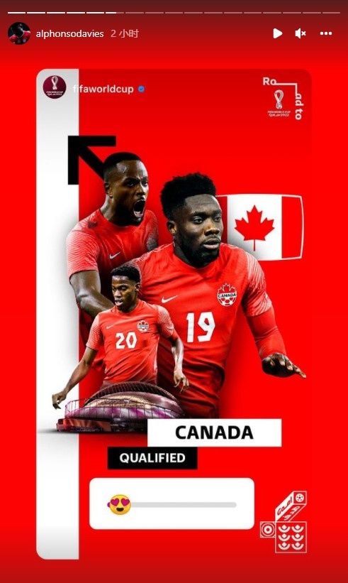 加拿大时隔36年历史第二次晋级世界杯决赛圈,阿方索-戴维斯在Instagram上晒出海报庆祝。